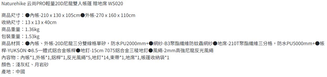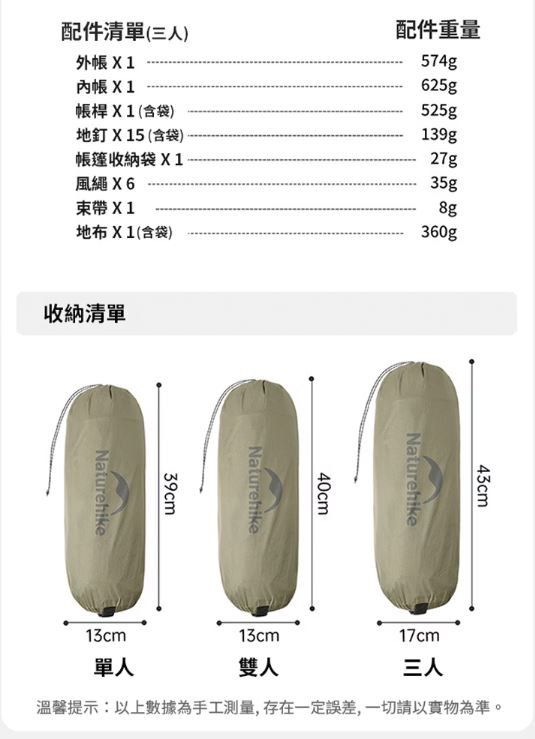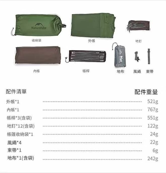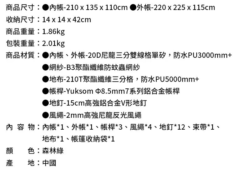配件:外帳*1、內帳*1、7001鋁合金帳桿*2、17cm地釘*15、2.5m風繩*6、束帶*1、收納袋*1