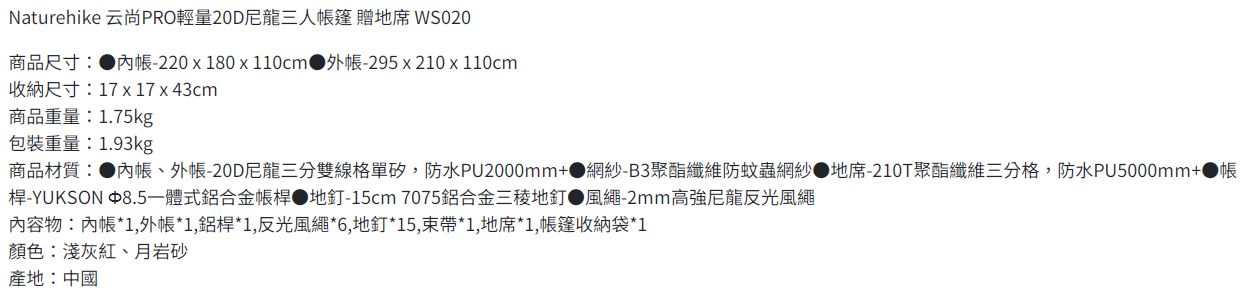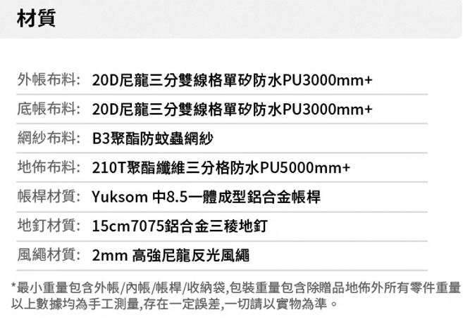 外帳材質:20D尼龍(矽膠塗層),防水係數2000mm
