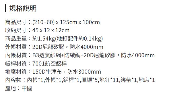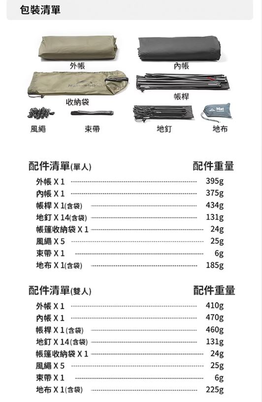 配件:外帳*1、內帳*1、7001鋁合金帳桿*2、17cm地釘*15、2.5m風繩*6、束帶*1、收納袋*1